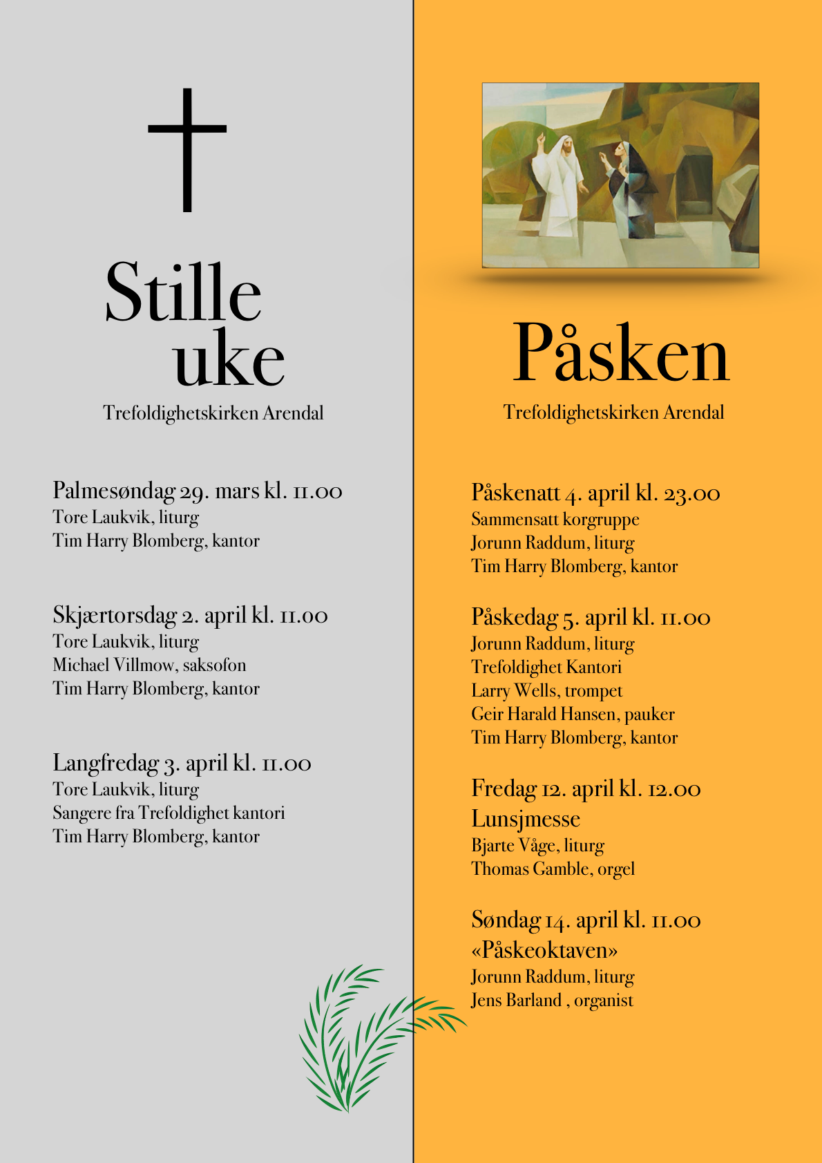 Her finner du oversikt over menighetens gudstjenester i den stille uke og i påsketiden! Velkommen til flotte gudstjenester i Trefoldighetskirken! Se program her